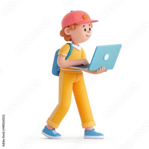 3D plastic cartoon icon of a standing student holding an open laptop, soft rounded shapes, shiny plastic finish, bright and clean colors, minimalistic style