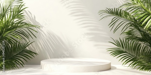 3D podium on a white background featuring palm leaves designed for summer beauty product promotion Natural 3D rendering with ample copy space in a minimalist trendy style