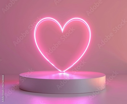 3D podium valentine day background with pink pedestal. Glow neon heart shape backdrop. Vector geometric platform. Mockup product display. Minimal wall scene. Stage showcase