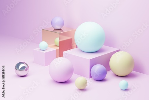 3D podiums pink background with spheres. Fashion podiums. Abstract composition in minimal design. Platforms for product display presentation.