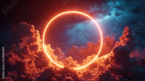 3d render, abstract cloud illuminated with neon light ring on dark night sky. Glowing geometric shape, round frame