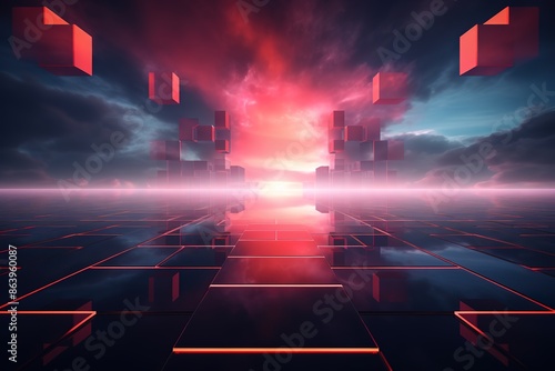3d render, abstract futuristic neon background, virtual reality cyberspace, pink blue vibrant colors, laser show stage