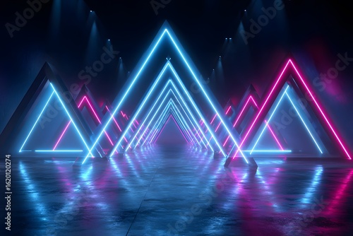 3D render, abstract neon background with glowing triangles in blue and pink colors. Futuristic light lines on a dark background