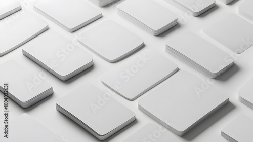 3d render, abstract white geometric background, minimal flat lay, twisted deck of square blank cards with rounded corners.
