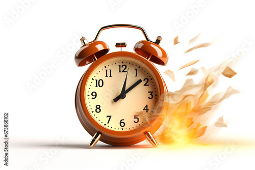3D render alarm clock hurry up, ringing watches with flash lightnings. Morning alert, time countdown, last chance sale or deadline concept, Illustration in cartoon plastic style on white background