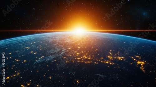 3d render Beautiful night view of the planet Earth from space, with lights in cities on the horizon, creating a global illumination.