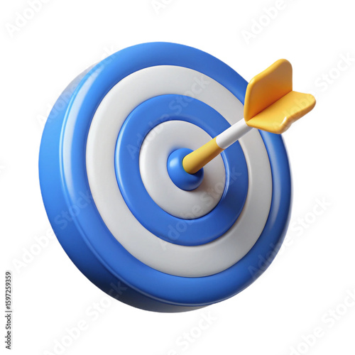 3D Render: Blue and White Target with Yellow Dart, Bullseye Hit, Success Concept, Achievement, Goal