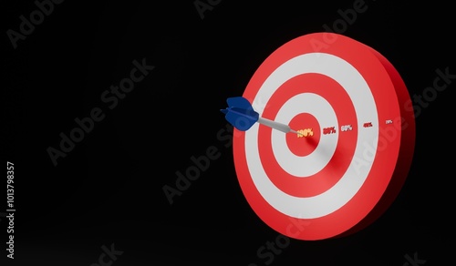3D render Blue arrow dart hitting the white and red target with number with percentage for show the successful on 100% goal on black background.