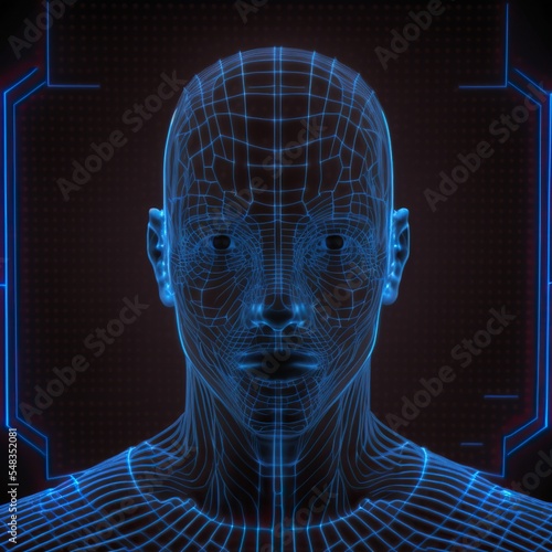 3d render character design male avatar in cyberspace metaverse matrix virtual world. Geometric traced lines outline.