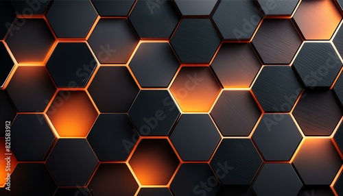 3d render Dark metal hexagon with orange beam background, illustration. Wallpaper, background with hexagons