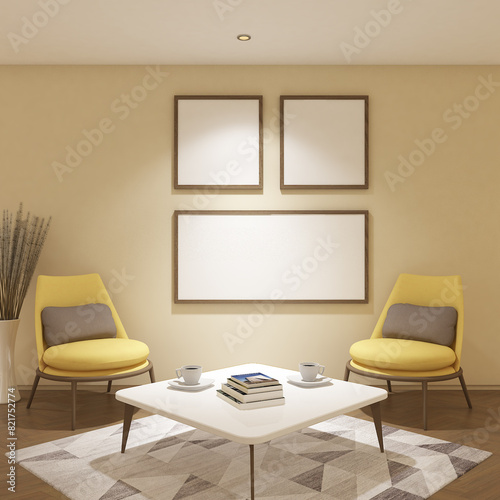 3d render illustration of foyer, armchair and coffee table with frame mockup pattern. Wood parquet, Yellow wall finish and white flat ceiling. Set 9