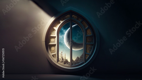 3D Render, Islamic Style Window With Crecent Moon On Dark Background. Islamic Religious Concept.