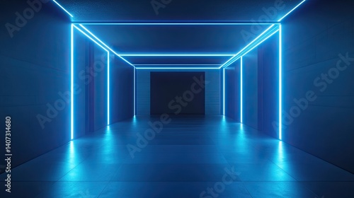 3D render of a blue abstract background with glowing neon lines and rays on a dark background