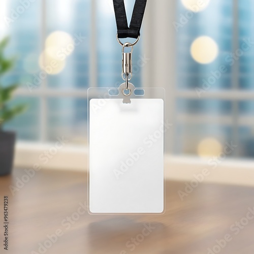 3D Render of a clear badge holder with a black lanyard attached to a window.