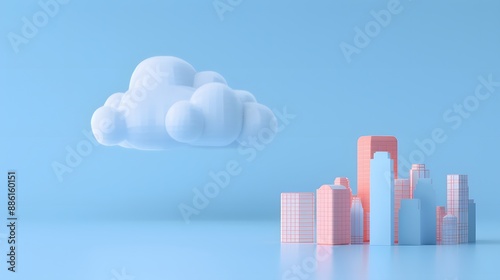 3D render of a cloud over a minimalistic cityscape with pastel-colored buildings against a blue background.