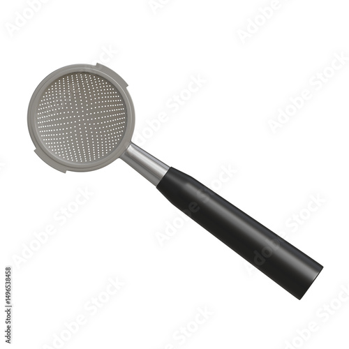 3D render of a coffee portafilter attached to a professional-grade espresso machine. The metal surface is reflective