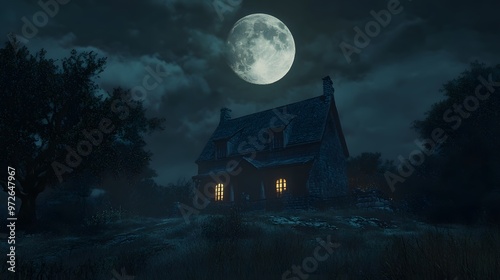 3D render of a creepy vampire house under a full moon, dark and scary setting