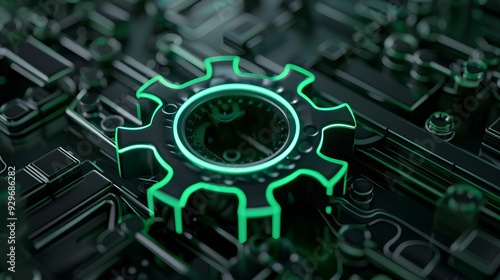 3D render of a glowing green gear icon on a black background with a circuit board pattern. The gear symbol is in neon light, representing a digital technology concept