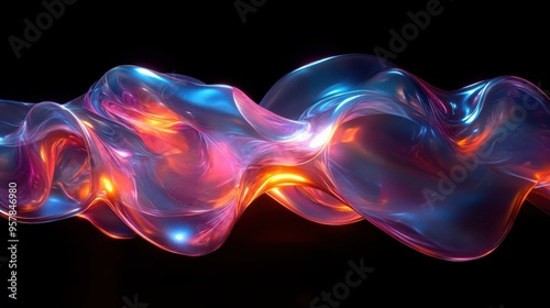 3D render of a glowing iridescent liquid glass element in a flexible holographic form. It morphs into a fluid drop, reflecting neon light, isolated on a black background.