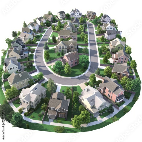 3D Render of a suburban neighborhood with single-family homes, on isolated white background, Generative AI