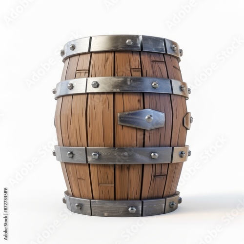 3D Render of a wooden barrel with metal bands, on isolated white background, Generative AI