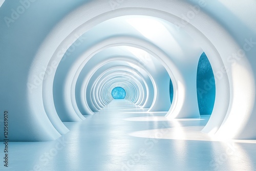 3D render of abstract futuristic background with white and blue lines forming an open tunnel, minimal style, isolated on a pastel background.