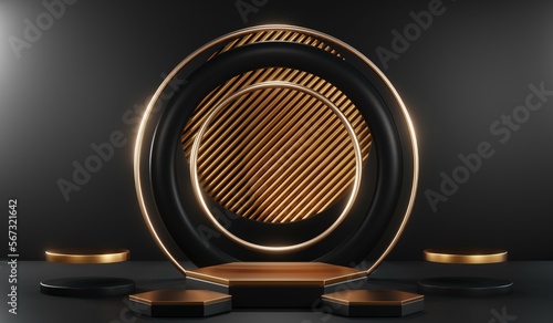 3d render of abstract realistic studio room with Luxury round pedestal stand podium with golden glitter in shape backdrop. Luxury black friday sale scene for product display presentation background
