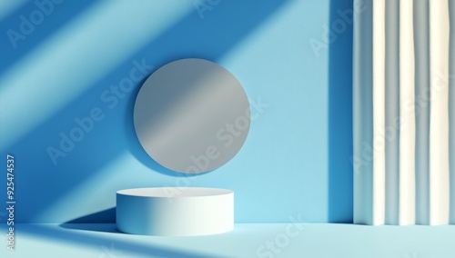 3D Render of Abstract White Minimalistic Podium with Round Mirror and Elegant Curtains