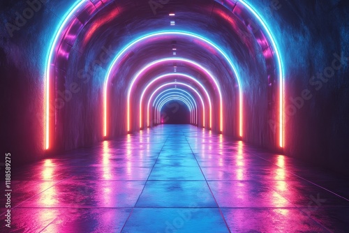 3D render of an abstract background with blue neon lines and glowing light rays in a dark room, creating a futuristic and vibrant atmosphere.