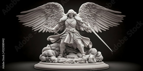 3D Render of Angelic Warrior Statue: A Winged Figure in Armor Stands Majestically, Sword Held Firmly, on a Rocky Base, Against a Dark Background.