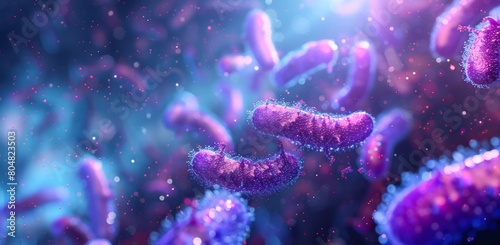 3d render of bacteria and prorounded by light effects. Abstract background for medical or science concept. BArrayList, high detail, high resolution, blue theme with purple glow, bright background