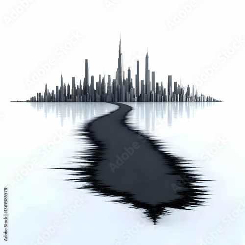3D Render of City Skyline with a Fractured Road Leading to It, Abstract Background
