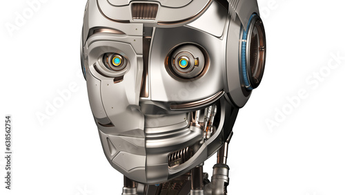 3D render of detailed futuristic robot or cyborg man with half face uncovered showing his metallic skull from one side and plastic skin from another. Isolated on transparent background