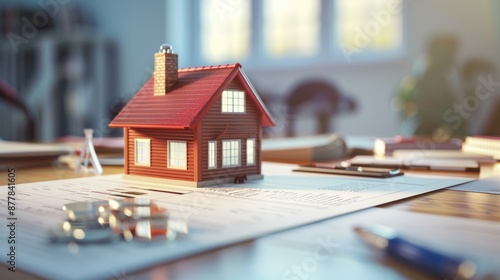 3d render of house on Mortgage papers and contract - Concept of house signing