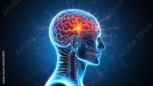 3D render of human head with brain, stress indicators glowing, frontal perspective, clinical look