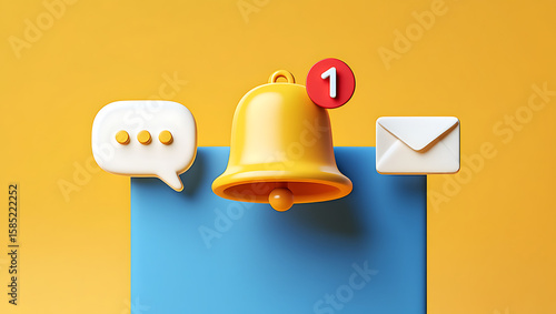3D Render of Notification Bell Chat Bubble and Email Envelope
