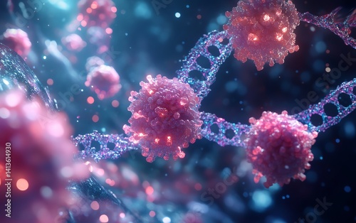 3D render of targeted therapy attacking cancer cells, surrounded by DNA helix and biopsy samples, healthcare and immunotherapy treatment symbol