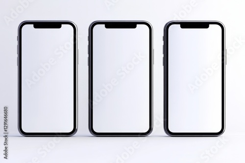 3D render of three modern smartphones with blank screens, isolated on a white background. Vector illustration showing front, side, and top views