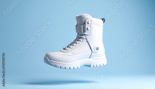 3D Render Of White Orthopedic Boot Floating On Light Blue Background With Detailed Texture and Design For Fracture Support
