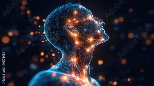 3D Render of X-Ray Human Head and Neck with Glowing Pain Points on Dark Blue Background