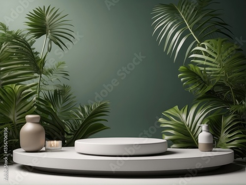 3D render podium, showcase on light white background with shadows in green tropical leaves of plant