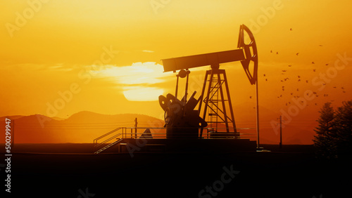 3D render silhouette of an oil rig station that pumps oil from a well at sunset