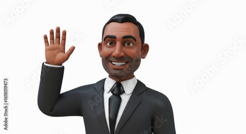 3D rendered man with dark skin, in suit, waves to viewer with smile, isolated on white background. Upper body focused