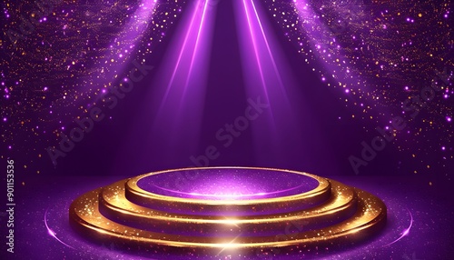 3D rendered podium for your product showcase. purple and golden round shapes with gold elements. Vector 3d illustration.