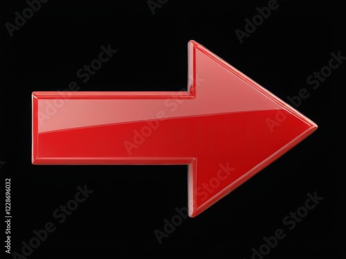 "3D rendered red arrow with glossy finish pointing right on black background - minimalist design concept"