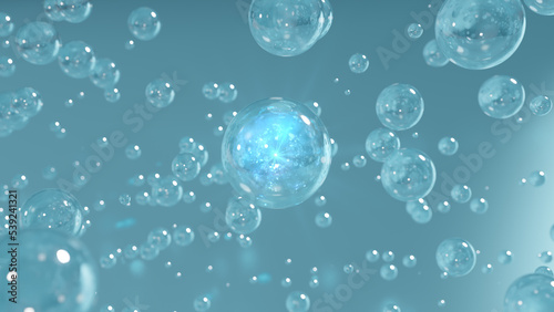 3D rendering Cosmetics Serum bubbles on defocus background. Miracle bubble design for cosmetics. Transparent balls, holographic liquid blobs floating in space, and artistic bubbles.