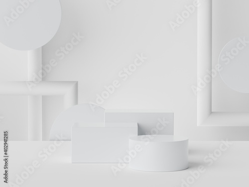 3d rendering geometric forms. Blank podium display in white marble color. Minimalist pedestal or showcase scene for present product and mock up.