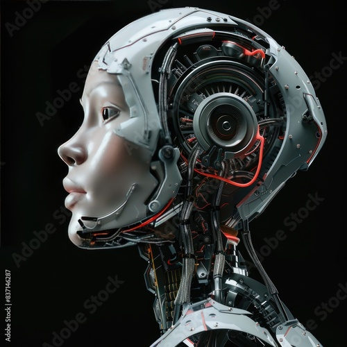 3D rendering head portrait of a robot woman in profile side view. Robot or cyborg woman on dark background