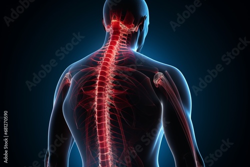 3D rendering medical illustration of male anatomy - spine, structure of back muscles and tendons. simple blue background Medical concept.