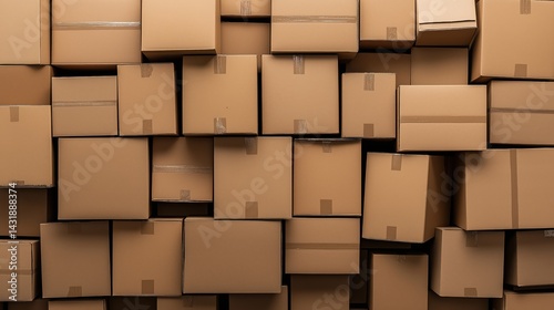 3D rendering of a chaotic pile of cardboard boxes in shades of brown and beige. This serves as a background for an online shopping, business, or delivery concept.